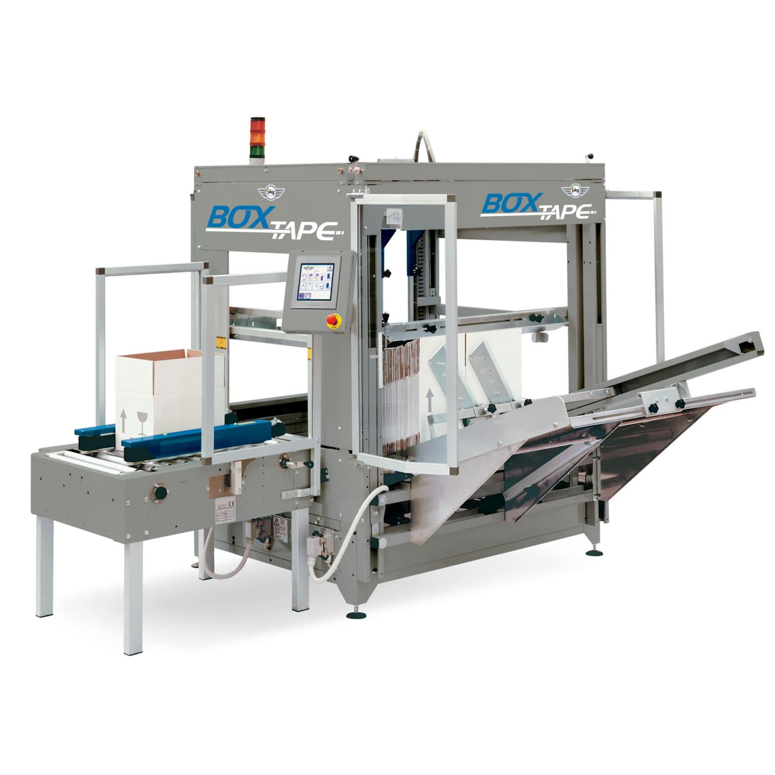 Easy to use. Quick box format adjustment, takes the flat sheet of cardboard from the lateral magazine and after folding the four lower flaps, the box is taped and ready for filling. Compact machine suited for use in every environment.