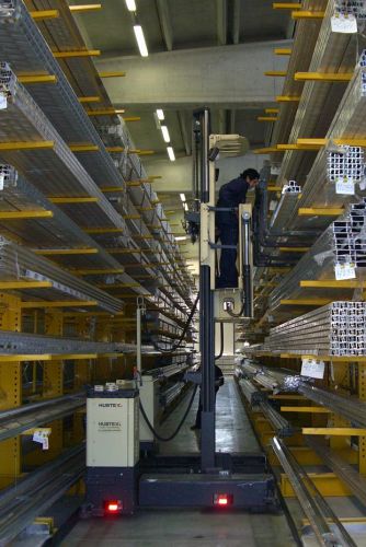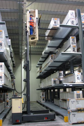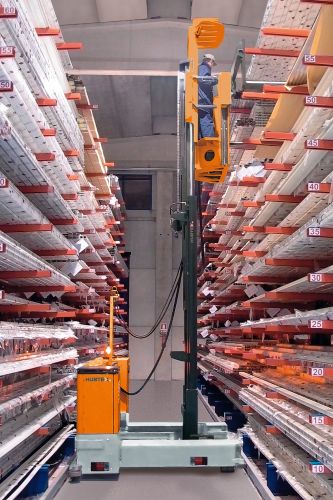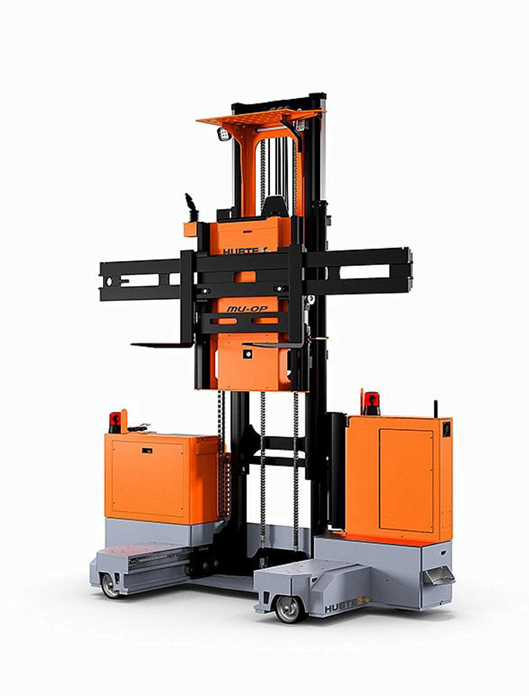 The MU-OP model is designed for one operator for the order picking of lightweight loads, such as aluminum, plastic or steel profiles. Its narrow rear frame, the optimized design of the lift mast and the central standup cab in front of the mast make the vehicle very narrow and therefore ideal for use in guided aisles. The central configuration of the standup cab in front of the lift mast gives the driver a clear view into the rack compartment, enabling him to pick light loads directly from the rack. Despite the slender design of the cab, all functions of the multidirectional sideloader are included, making the truck a fully-fledged electric multidirectional sideloader. This means that this vehicle can transport complete packs and bundles or provide manual assistance for order picking processes.