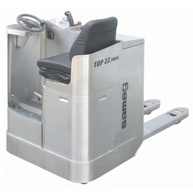 The stainless steel pallet truck with seated operator characterized by extraordinary use flexibility and driving comfort. The frame is fully made of stainless steel, thus it is intended to be used in environments where cleanliness and hygiene are essential conditions and where there are problems of corrosion.