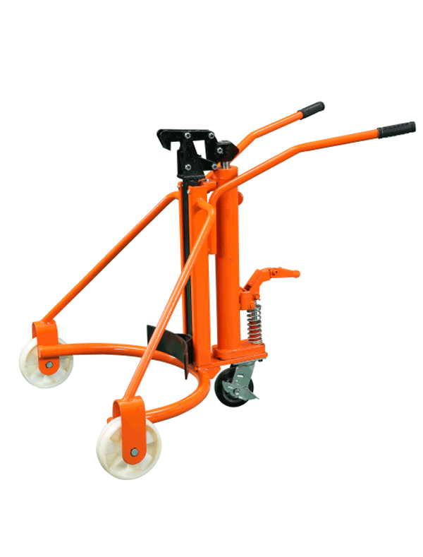 Manual drum lift trucks can lift, handle, rotate, tilt and drain chemicals from fully loaded drums or chemical drums. The drum has a double protective finger lock to ensure the balance of the drum being lifted. The oil barrel can be locked vertically to prevent oil or chemicals from overflowing from the oil barrel, and the oil barrel can be locked horizontally to prevent oil or chemicals from being discharged from the gas nozzle. When unlocked, the drum can be repeatedly rotated to agitate the oil or chemicals inside, and can be fixed by hand at any angle.