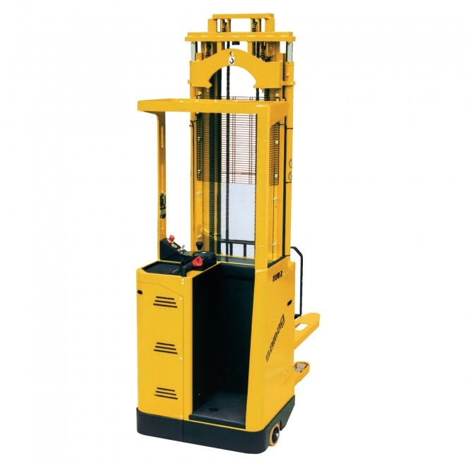 Reach truck with standing operator for narrow and high environments. Handling of pallets up to 6.500 mm in narrow corridors. During horizontal movements, thanks to the transverse driving position, the operator has the best visibility conditions to make the most of the travelling speed.